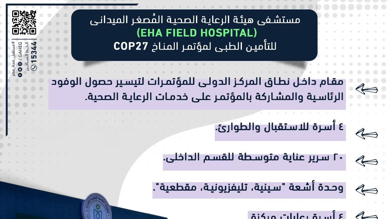 تعلن الهيئة العامة للرعاية الصحية، برئاسة الدكتور أحمد السبكي، رئيس مجلس إدارة الهيئة، مساعد وزير الصحة والسكان، المشرف العام على مشروع التأمين الصحي الشامل، استعدادات مستشفى هيئة الرعاية الصحية المُصغر الميداني (EHA FIELD HOSPITAL) للتأمين الطبي لمؤتمر المناخ <<COP27>> .