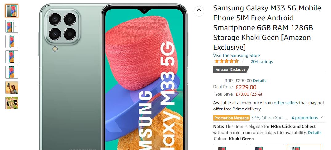 جهاز آخر ضمن سلسلة Galaxy حصل على تخفيض كبير في سعره وهو هاتف Galaxy M33 5G، فهو متاح حاليا لعشاق هواتف سامسونج في المملكة المتحدة مقابل سعر 229 جنيه استرليني (أي ما يقرب من 6200 جنيه مصرى)، ويتميز هذا الهاتف بكاميرا خلفية رباعية الرئيسية منها بدقة 50 ميجابكسل، ويأتي مزودا بشاشة بقياس 6.6 بوصة، مع معالج سريع ثماني النواة وتخزين قابل للتوسيع.