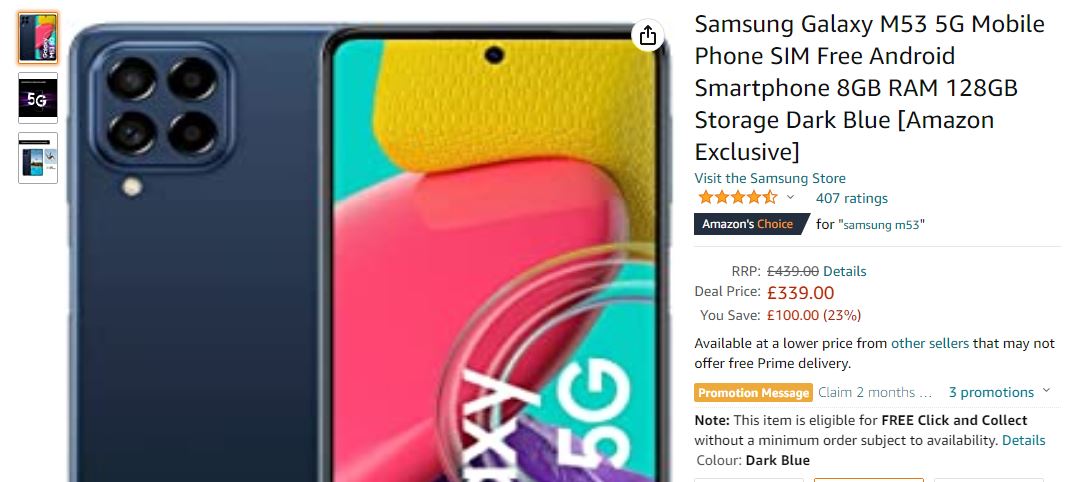 بينما حصل جهاز آخر من سامسونج Galaxy، على خصم يقدر بـ100 جنيه استيرليني، حيث يتوفر هاتف Galaxy M53 5G ضمن موسم التخفيضات في بريطانيا مقابل سعر 339 جنيه استرليني (أي ما يقرب من 8900 جنيه مصرى)، ويتميز هذا الهاتف بكاميرا خلفية رباعية الرئيسية منها بدقة 108 ميجابكسل، ويأتي مزودا بشاشة بقياس 6.7 بوصة، مع معالج سريع ثماني النواة وتخزين قابل للتوسيع.