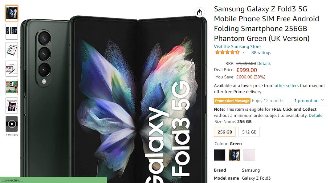 وكجزء من عروض بيع Galaxy، يأتي هاتف سامسونج القابل للطي Galaxy Z Fold 3، بسعر مخفض بنسبة 38 %، حيث يتوفر على أحد مواقع التجارة الالكترونية ببريطانيا مقابل سعر 999 جنيه استرليني (أي ما يقرب من 27100 جنيه مصرى)، عند الإطلاق، كانت تكلفة هذا الجهاز تزيد عن 1500 جنيه إسترليني (أي ما يقرب من 40800 جنيه مصرى).