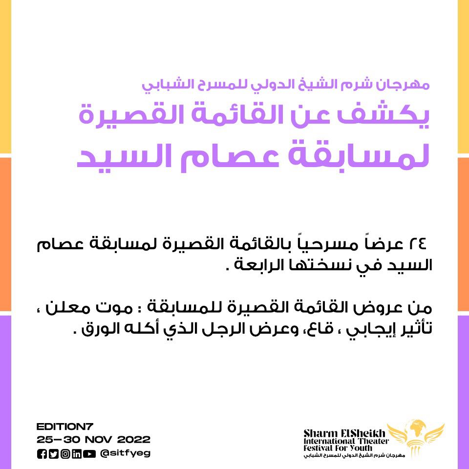 كشف مهرجان شرم الشيخ الدولي للمسرح الشبابي برئاسة الفنان مازن الغرباوي عن القائمة القصيرة لمسابقة عصام السيد للعمل الأول في نسختها الرابعة ، بالدورة السابعة ، والتي تشكلت لجنة تحكيمها من الكاتب والناقد محمد الروبي ، الفنان حمزة العيلي ، المخرج ناصر عبد المنعم .