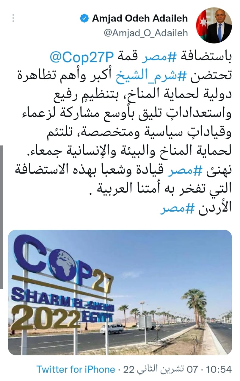 كتب السفير الأردني في القاهرة أمجد العضايلة على حسابه الشخصي على موقع التواصل الاجتماعي تويتر مشيداً باستضافة وتنظيم مصر لقمة المناخ "كوب ٢٧"، والتي تفخر بها أمتنا العربية.