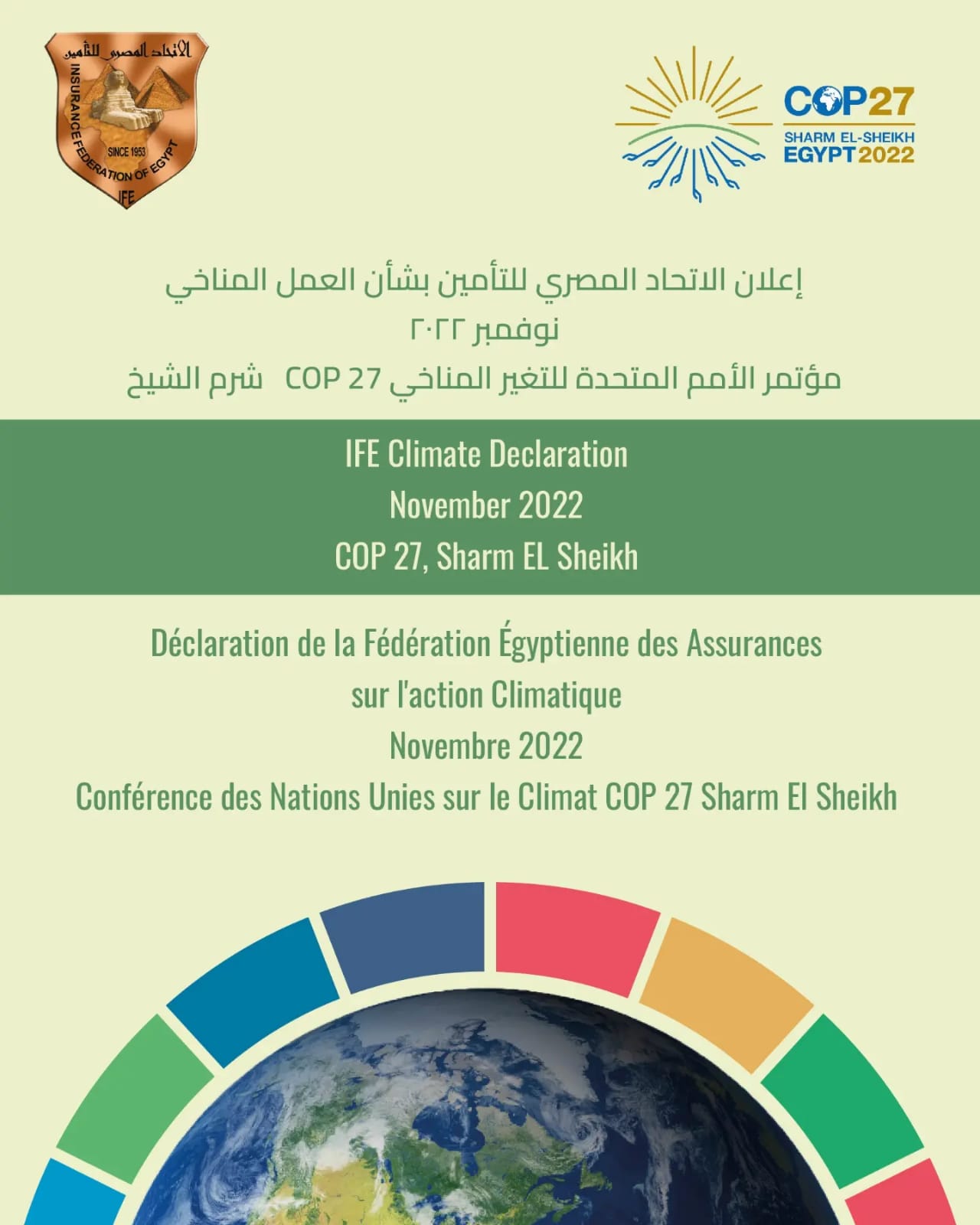 ويأتي هذا تزامنا مع مشاركة الاتحاد الفعالة في فاعليات قمة الامم المتحدة للتغير المناخي COP 27 ، من خلال عقد عدد من ورش العمل بالمشاركة مع كبار شركات التأمين وإعادة التأمين العالمية و اتحادي التأمين الفرنسي والمغربي فضلا لورش عمل خلال يومي الطاقة والنقل بالقمة.