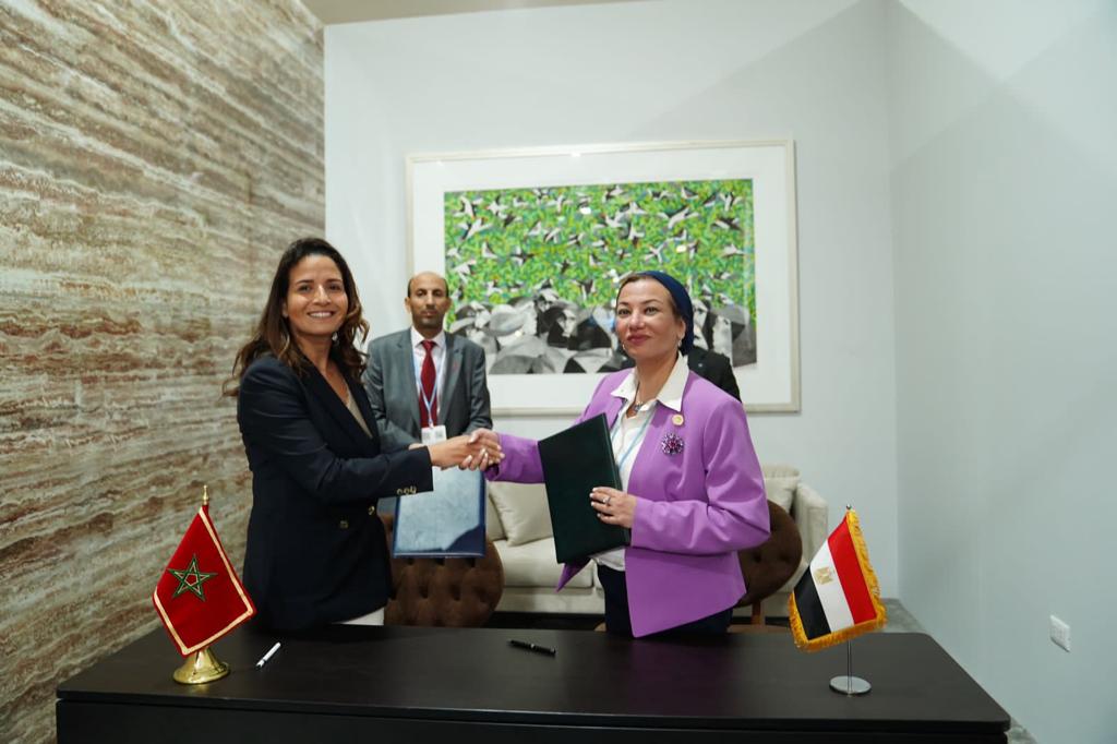 وقعت الدكتورة ياسمين فؤاد وزيرة البيئة والمنسق الوزاري ومبعوث مؤتمر المناخ COP27 والدكتورة ليلي بنعلي وزيرة الانتقال الطاقي والتنمية المستدامة بالمملكة المغربية مشروع مذكرة تفاهم بين جمهورية مصر العربية والمملكة المغربية لتعزيز التعاون فى مجال حماية البيئة والتنمية المستدامة على هامش قمة مؤتمر المناخ COP27 المنعقدة بمدينة شرم الشيخ.