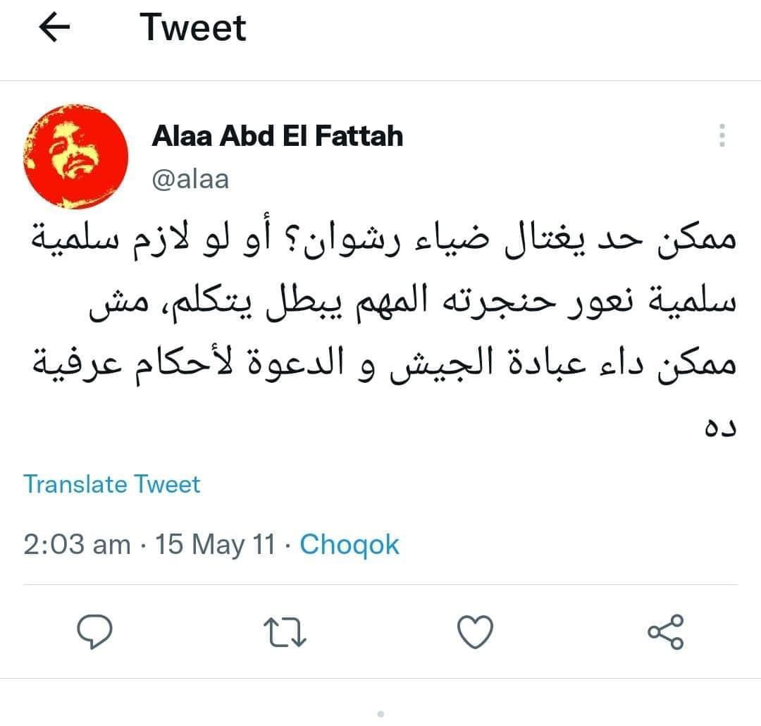 وما كشف عنه اليوم النشطاء وتم تداوله على نطاق واسع، كانت تغريدة حرض فيها علاء عبد الفتاح على قتل ضياء رشوان الكاتب الصحفي الوطنين نقيب الصحفيين، ورئيس الهيئة العامة للإستعلامات، ومنسق عام مجلس أمناء الحوار الوطني.
