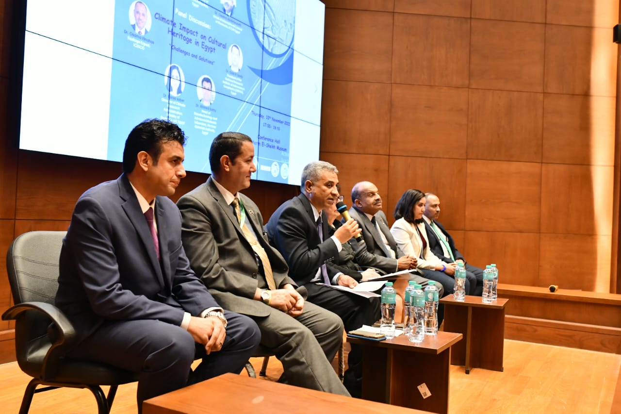 في إطار الفعاليات التي تنظمها وزارة السياحة والآثار على هامش استضافة مصر لمؤتمر الأطراف السابع والعشرين لاتفاقية الأمم المتحدة لتغير المناخ COP27 المُنعقد حالياً بمدينة شرم الشيخ وتستضيفه مصر خلال الفترة من 6 حتى 18 نوفمبر الجاري، نظم المجلس الأعلى للآثار ممثلاً في قطاع المتاحف، جلسة بعنوان "تأثير المناخ على التراث الثقافي في مصر- تحديات وحلول"، والتي انعقدت بمتحف شرم الشيخ، وشارك فيه الأستاذ مؤمن عثمان رئيس قطاع المتاحف بالمجلس الأعلى للآثار.