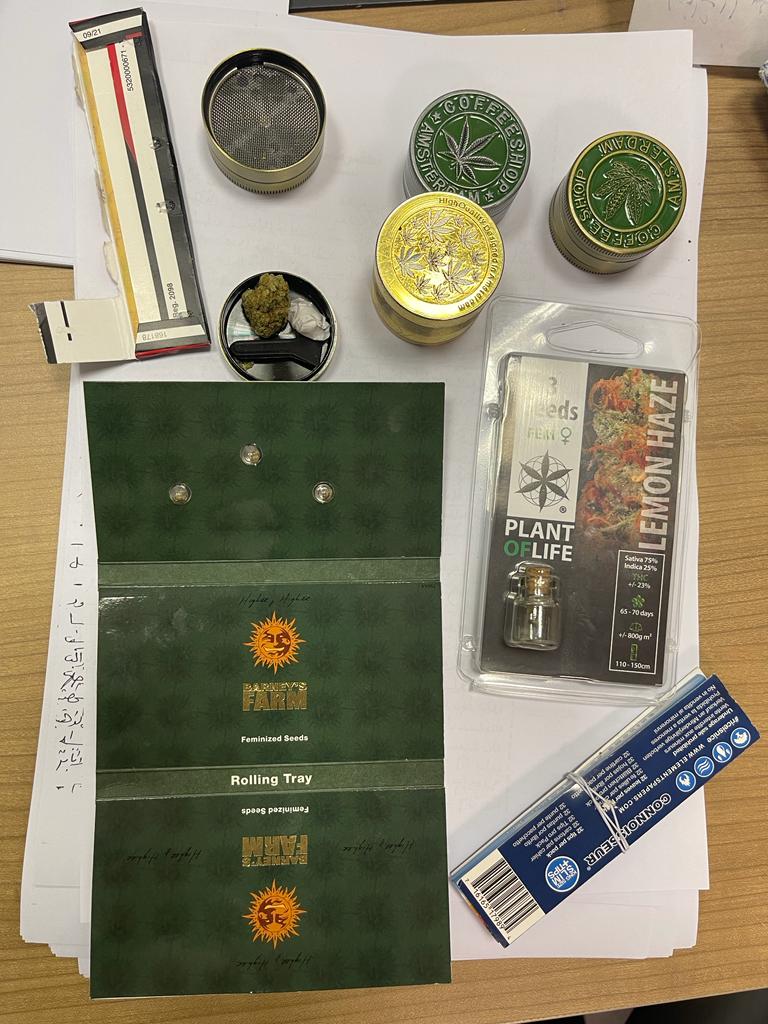 قام حازم محمد علي مدير الحركة المشرف على الصالة بتكليف بسمة حسني عبد الحميد مأمور الجمرك بتفتيش حقائب الراكب يدويا مما اسفر عن ضبط ٤ مطحنة تستخدم في تعاطي المخدرات باحداهم قطعة من مخدر الماريجوانا وزجاجة صغيرة بداخلها ٣ بذور لنبات الماريجوانا المخدر وغلاف كرتون به ٣ بذور لنفس النبات المخدر كما تم ضبط لفافة بها قطعة من مخدر الحشيش.