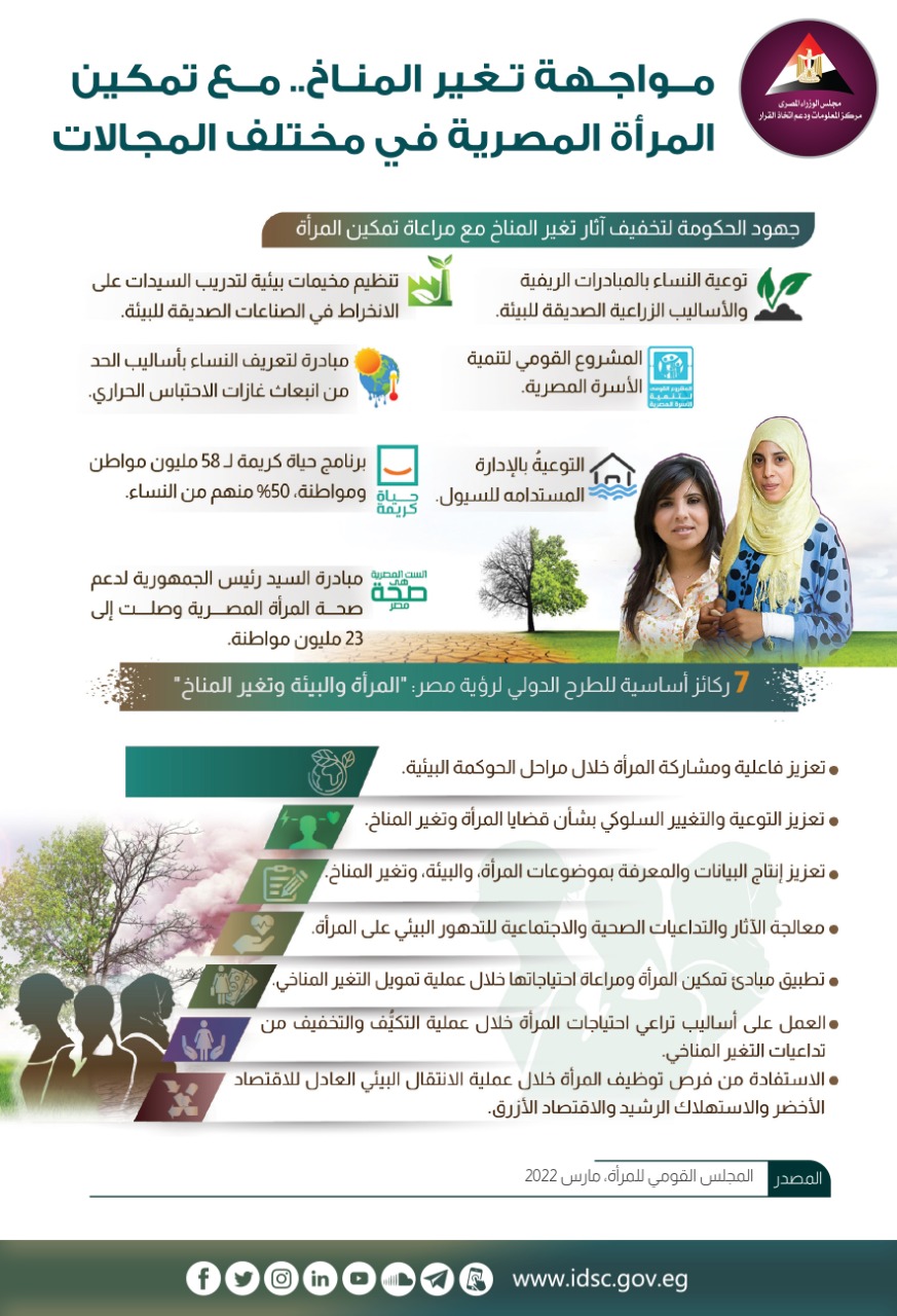 نشر مركز المعلومات ودعم اتخاذ القرار بمجلس الوزراء إنفوجراف عبر صفحته الرسمية على موقع التواصل الاجتماع فيس بوك بعنوان " مواجهة تغير المناخ.. مع تمكين المرأة المصرية في مختلف المجالات.
