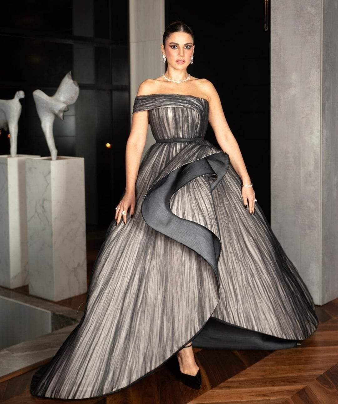وأولهم حضورا كانت الفنانة مي عمر التي ارتدت فستان أسود أنيق من تصميم اللبناني زهير مراد من مجموعته للأزياء الجاهزة لشتاء 2022، من خامتي الشيفون والدانتيل، وكان التصميم الأصلي للفستان بفتحة V طويلة عند الصدر، وشفافا طوال الفستان.
