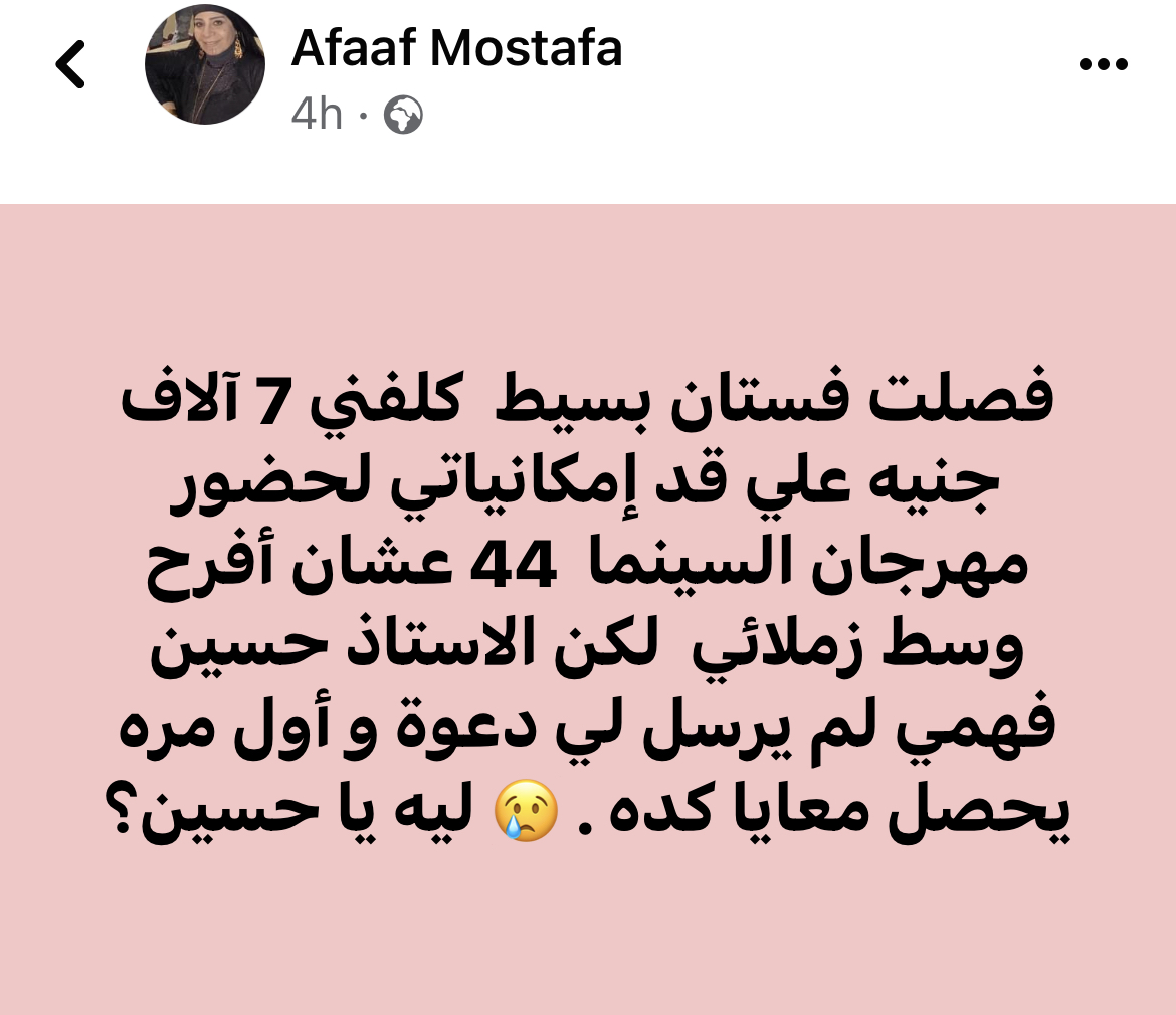 وقالت عفاف مصطفي: “فصلت فستان بسيط كلفني 7 آلاف جنيه علي قد إمكانياتي لحضور مهرجان السينما 44 عشان أفرح وسط زملائي، لكن الاستاذ حسين فهمي لم يرسل لي دعوة وأول مره يحصل معايا كده.. ليه يا حسين؟”.