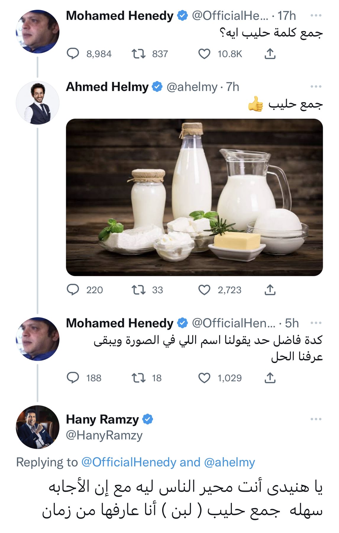 وشارك الفنان هاني رمزي مازحًا في تويتة خاصة به: “يا هنيدى أنت محير الناس ليه مع إن الإجابة سهله جمع حليب ( لبن ) أنا عارفها من زمان”.