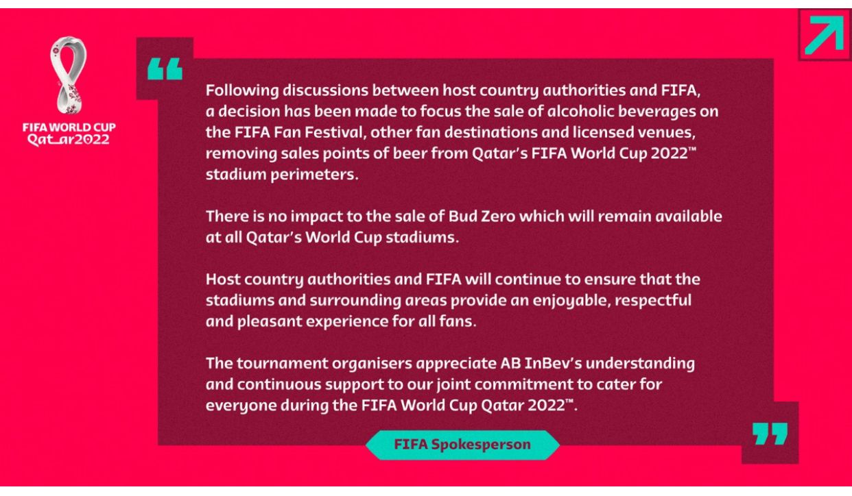 ولفت البيان إلى أن "منظمي البطولة يعربون عن تقديرهم لتفهم شركة AB InBev ودعمها المستمر لالتزامنا المشترك من أجل خدمة الجميع خلال كأس العالم 2022 في قطر".