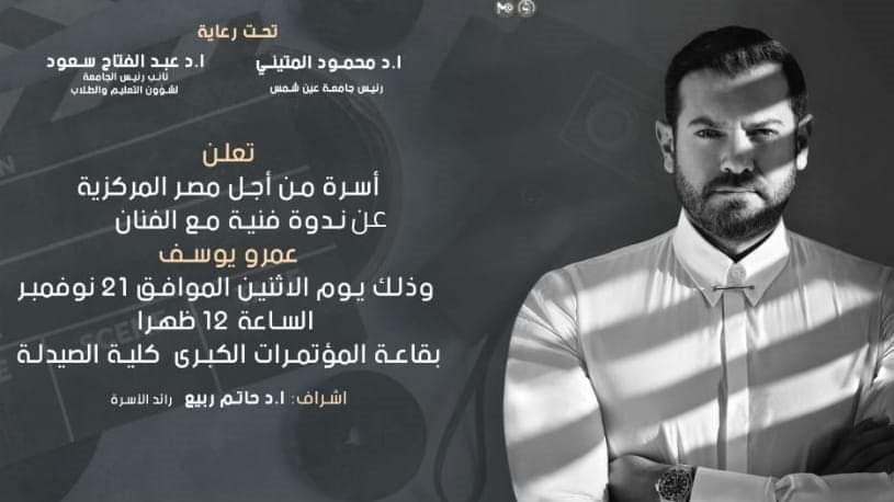 نظمت أسرة طلاب من أجل مصر بجامعة عين شمس، اليوم، ندوة حوارية فنية مع الفنان عمرو يوسفافتتح الدكتور عبد الفتاح سعود نائب رئيس جامعة عين شمس الندوة واشراف الدكتور حاتم ربيع رائد الأسرة.