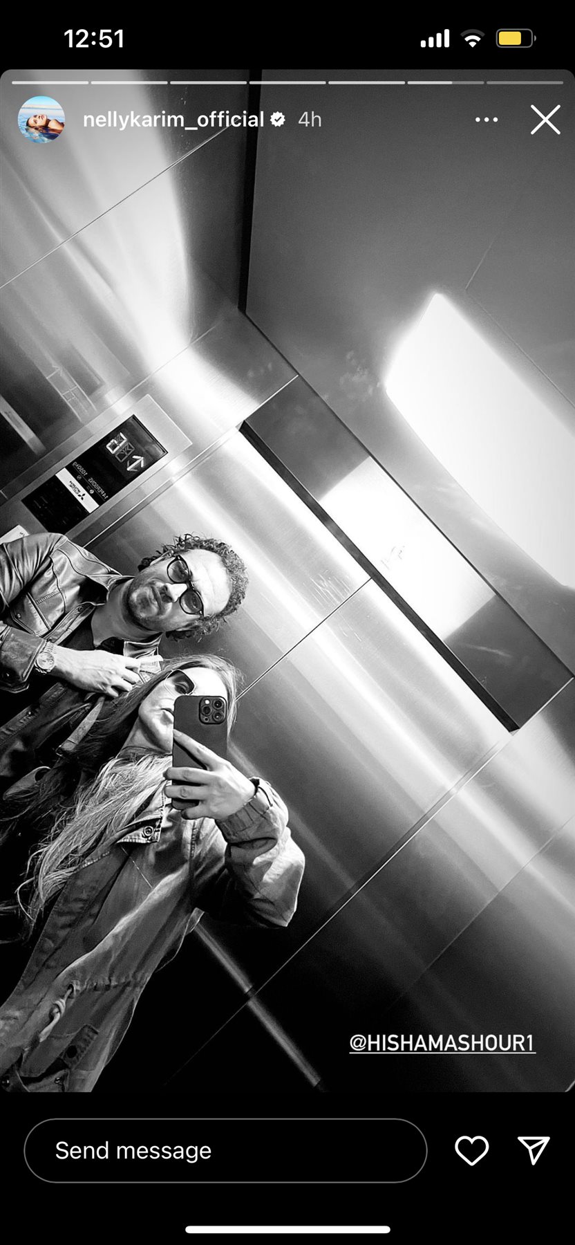 وظهرت نيللي كريم، بصحبة زوجها هشام عاشور من الاسانسير، والتقطا سيلفي معا بأجواء رومانسية.