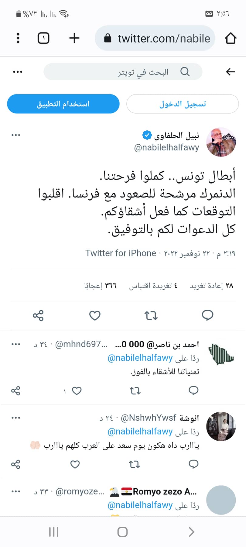نشر الفنان نبيل الحلفاوى تعليقا عبر حسابه على موقع التواصل الاجتماعى تويتر بعد فوز المنتخب السعودى على نظيرة الارجنتينى بهدفين مقابل هدف ويوجه رسالة الى المنتخب التونسى.