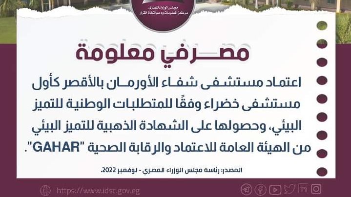 نشر مركز المعلومات ودعم اتخاذ القرار بمجلس الوزراء إنفوجرافا عبر صفحته الرسمية على موقع التواصل الاجتماعي “فيس بوك”، حول اعتماد مستشفى شفاء الأورمان بالأقصر كأول مستشفى أخضر.