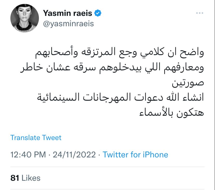 وكانت كتبت ياسمين رئيس :" إمتى تخلص ظاهرة المرتزقة اللي بتدخل تتصور في مهرجان سينمائي، وهما حتى معدوش في مشهد ورا الكاميرا.. لا يصح إلا الصحيح".