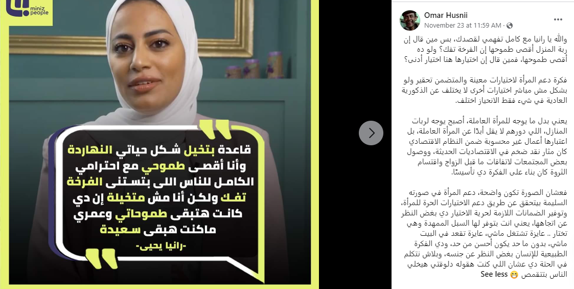 وقال عمر حسني: “والله يا رانيا مع كامل تفهمي لقصدك، بس مين قال إن ربة المنزل أقصى طموحها إن الفرخة تفك؟ ولو ده أقصى طموحها، فمين قال إن اختيارها هنا اختيار أدنى؟، فكرة دعم المرأة لاختيارات معينة والمتضمن تحقير ولو بشكل مش مباشر اختيارات أخرى لا يختلف عن الذكورية العادية في شيء فقط الانحياز اختلف”.