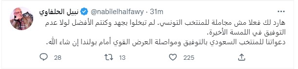 وقال نبيل الحلفاوى : “هارد لك فعلا مش مجاملة للمنتخب التونسي. لم تبخلوا بجهد وكنتم الأفضل لولا عدم التوفيق في اللمسة الأخيرة.. دعواتنا للمنتخب السعودي بالتوفيق ومواصلة العرض القوي أمام بولندا إن شاء الله”.