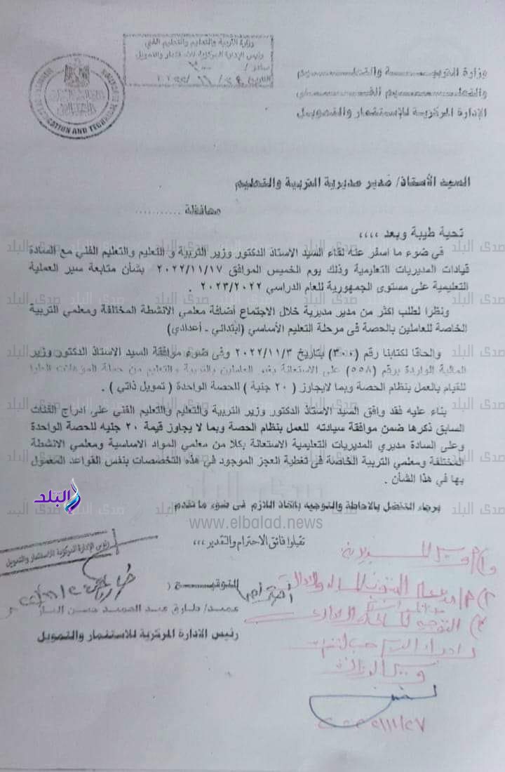 وكان قد أعلن الدكتور رضا حجازي وزير التربية والتعليم والتعليم الفني في الكتاب الدوري 300 الصادر بتاريخ 3 نوفمبر 2022 ، الموافقة على الاستعانة بغير العاملين بالتربية والتعليم من حملة المؤهلات العليا للقيام بالعمل بنظام الحصة وبما لا يجاوز 20 جنيه للحصة الواحدة “تمويل ذاتي”