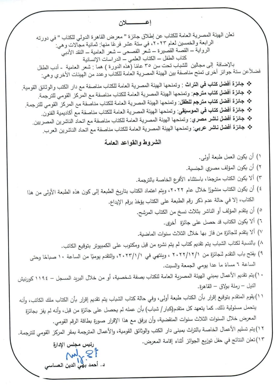11) يقوم المتقدم بتوقيع إقرار بأن الكتاب طبعة أولى، وفي حالة كتاب الشباب يتم تقديم إقرار بأن الكتاب ملك الكاتب، وأنه يتحمل مسئولية ذلك. كما يتعهد كل متقدم(كبار/ شباب) بأن عمله لم يحصل على جائزة من قبل، وأنه لم يفز بجائزة المعرض خلال السنوات الثلاث سنوات المنقضية، وأن يرفق مع هذا الإقرار صورة بطاقة الرقم القومي.