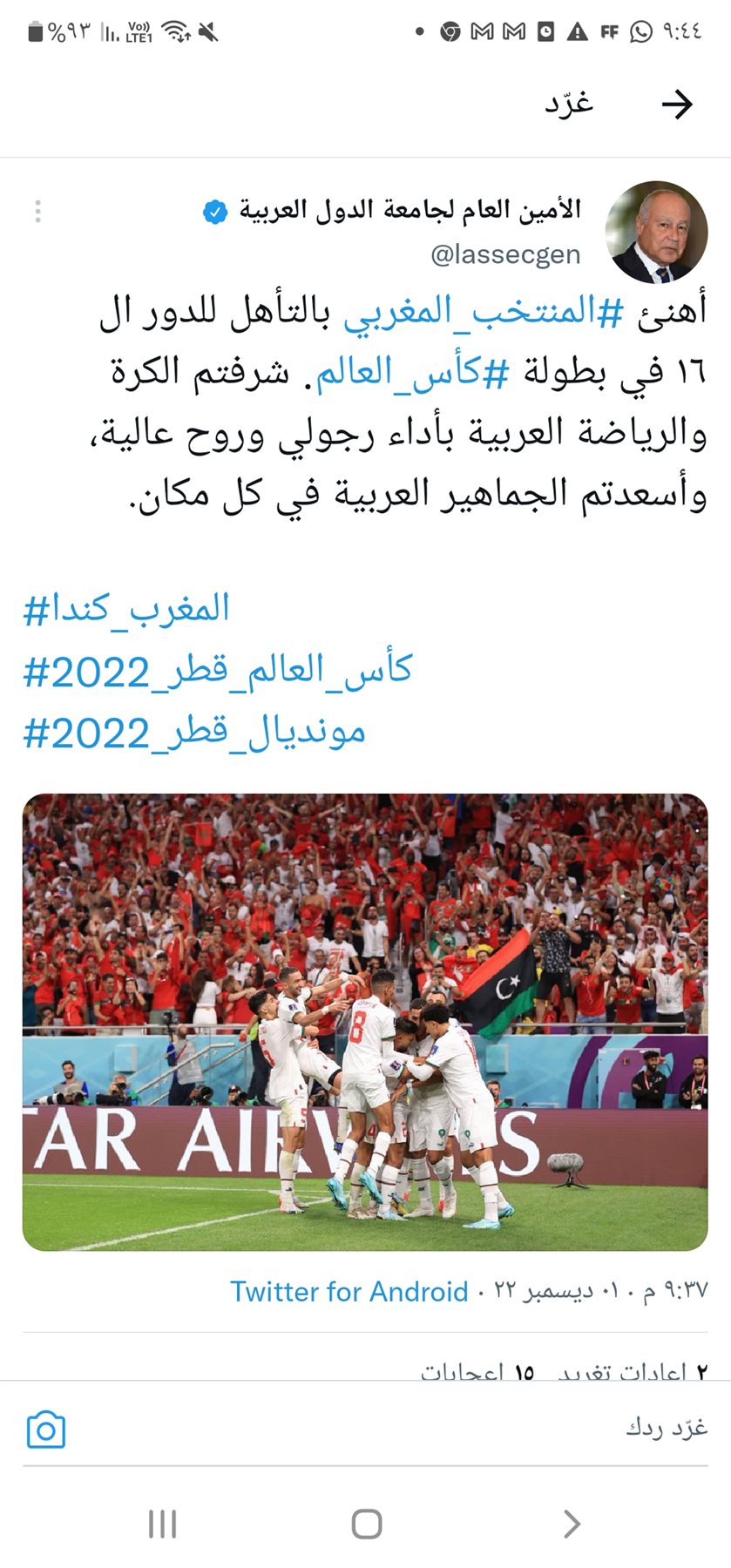 وقال أبو الغيط، خلال تغريدة له عبر صفحته الرسمية على تويتر؛ نهنئ #المنتخب_المغربي بالتأهل للدور ال ١٦ في بطولة #كأس_العالم. شرفتم الكرة والرياضة العربية بأداء رجولي وروح عالية، وأسعدتم الجماهير العربية في كل مكان.