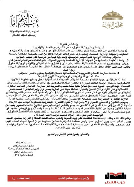 وقال “إمام” في طلب الإحاطة، إن “إخضاع رسالة المحاماة لنظام الفاتورة الإلكترونية على غير سند من دستور أو قانون سوى الهوى و الغرض فقط ، ولما كانت المحاماة كرسالة عملا بحكم المادة ١٩٨ من الدستور مهنة حرة مستقلة تشارك السلطة القضائية فى تحقيق العدالة ، كما سبق و صدر قرار وزير المالية باعتبار مهنة المحاماة من المهن غير التجارية و من ثم فإن المحاماة ليست عملا تجاريا و لا سلعة تباع و تشترى و إنما هو جهد عقلى إستلزمه الدستور والقانون فى محراب تطبيق القانون لتحقيق العدالة فلا عدالة بلا محاماة ولا محاماة بلا إستقلال كما أن كثرة التشريعات والقوانين وإطلاق يد السلطة التنفيذية فى وضع تقرير الاجراءات وتنفيذ الالتزامات قد اطلق يد الادارة الضريبية دون رقيب وفى غيبة المجلس الأعلى للضرائب المصرية المنصوص عليه قانونا ضمن نصوص وأحكام القانون رقم 91 لسنة 2005 والصادر بتشكيله قرار رئيس الجمهورية رقم 358 لسنة 2010 بعد موافقة مجلس الوزاراء بجلسته المنعقدة 9/11/2010 والذى يهدف الى ضمان حقوق دافعى الضرائب على اختلاف أنواعها والتزام الإدارات الضريبية المختصة بأحكام القوانين واللوائح الصادرة فى هذا الشأن، وأن تتم إجراءات الربط والتحصيل فى إطار من التعاون وحسن النية، وتوجيه الممولين إلى الإجراءات القانونية التى تكفل حصولهم على حقوقهم، والمختص قانونا بالآتي:
