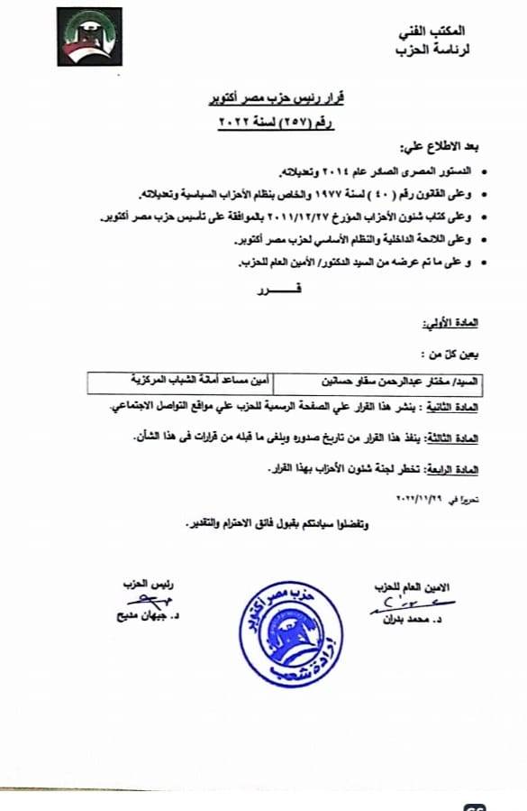 أصدر حزب مصر أكتوبر بقيادة الدكتورة جيهان مديح رئيس الحزب والدكتور محمد بدران النائب الأول لرئيس الحزب والأمين العام، قرارا تنظيميا بتعيين مختار سقاو، أمين الشباب المساعد بالأمانة المركزية للحزب.