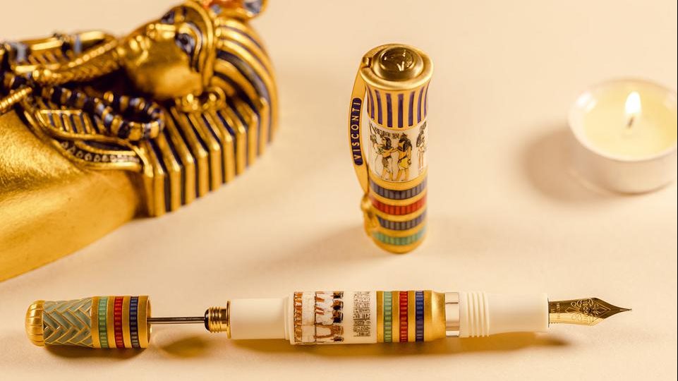 وبهذه المناسبة، أصدرت شركة فيسكونتي عددا محدودا من مجموعة أقلام تذكرنا بالعديد من القطع الأثرية من مقبرة توت عنخ آمون، لامعة بالذهب لتذكر كل من يراها بما شاهده كارتر في مقبة توت عنخ آمون.