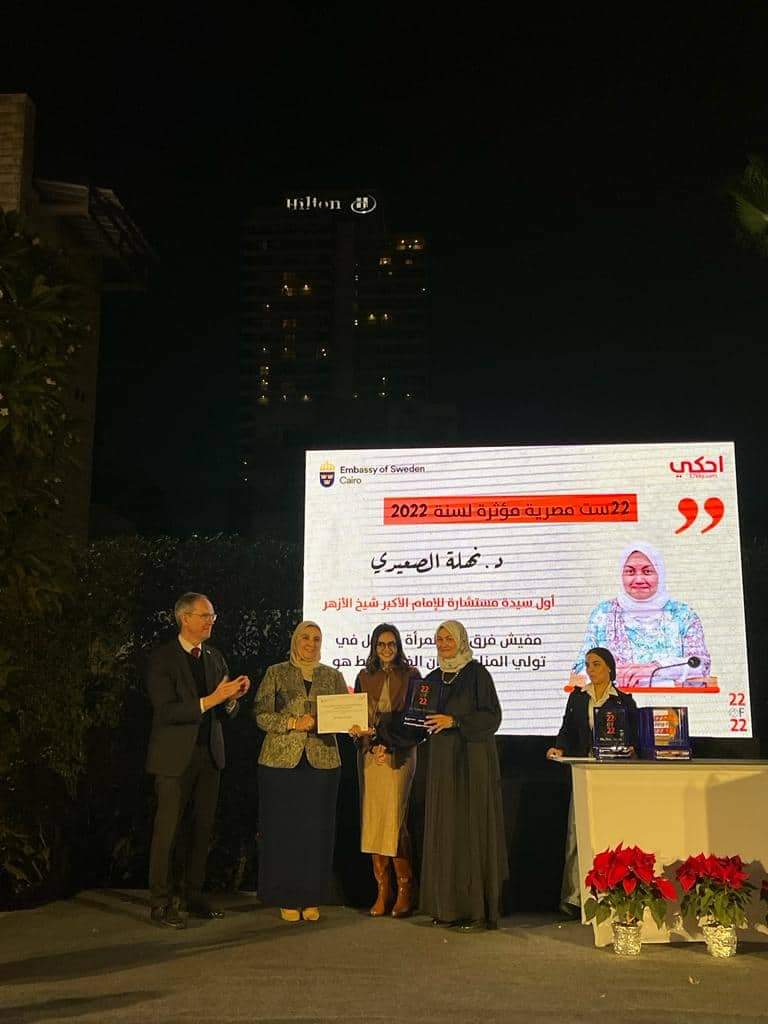 كرمت اليوم الدكتورة نهلة الصعيدي رئيس مركز تطوير تعليم الطلاب الوافدين وعميد كلية العلوم الإسلامية الأزهرية للطلاب الوافدين، من قبل السيد هاكان إمسجارد السفير السويدي، والسيدة نميس أرنوس مؤسس مجلة(احكي)، وبحضور د.نيفين القباج وزيرة التضامن الاجتماعي؛ لكونها ضمن ٢٢ شخصية نسائية مؤثرة خلال عام٢٠٢٢م؛ وذلك في الاستفتاء الصادر من قبل مجلة احكي، بالتعاون مع سفارة السويد بمصر. بالإضافة إلى تكريمها لكونها نموذجًا ملهمًا ومؤثرًا يحتذى به في مجال تمكين المرأة والتأكيد على قدرتها في أن تقوم بعمل جميع المهام وتعمل على تحقيقها بنجاح، بجانب نشاطها الكبير في توفير منظومة تعليمية متكاملة بجودة عالمية لخدمة الطالب الوافد بالأزهر، ونجاحها في تقديم العديد من الإنجازات خلال فترة وجيزة، وشغلها العديد من المناصب المهمة والحيوية المؤثرة في بلدها ومجال عملها.