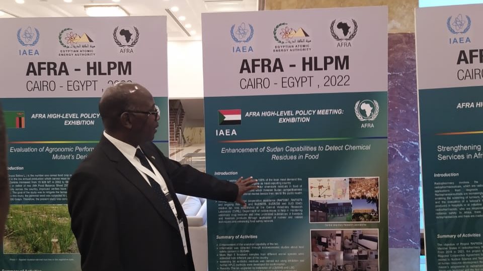 وكذلك تم عرض مشروعات استخدمات التقنیات النوویة لدراسة مصادر المیاه بكینیا، ومتابعة نظائر الرصاص والكادمیوم في الغذاء بلیبیا، انتاج طفرات الطماطم بموریشیوس، انتاج طفرات السمسم بالنیجر، و انتاج طفرات الصویا بالكونغو، و مكافحة ذبابة الفاكھة في نیجیریا، و مكافحة الاضافات الكیمیائیة بالغذاء في السودان.