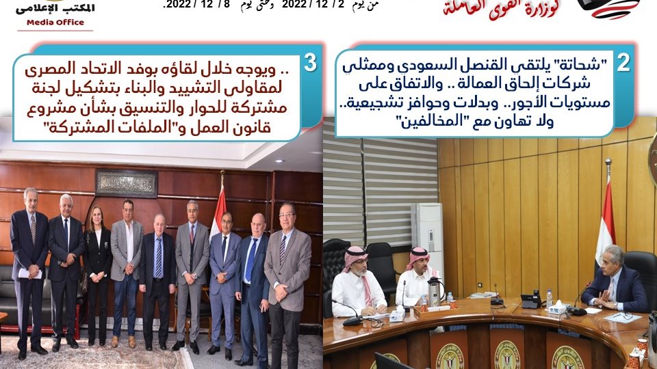 وفي لقائه مع وفد الاتحاد المصري لمقاولي التشييد والبناء برئاسة المهندس محمد سامي سعد، وافق وزير القوى العاملة ،على طلب ممثلي الاتحاد المصري بتشكيل لجنة دائمة مع الوزارة لبحث كافة الملفات والحوار بشأن القضايا المشتركة، بهدف صناعة بيئة عمل لائقة تستفيد منها عملية التنمية،وتُحقق المزيد من الأمان الوظيفي والمهني للعاملين في هذا المجال.