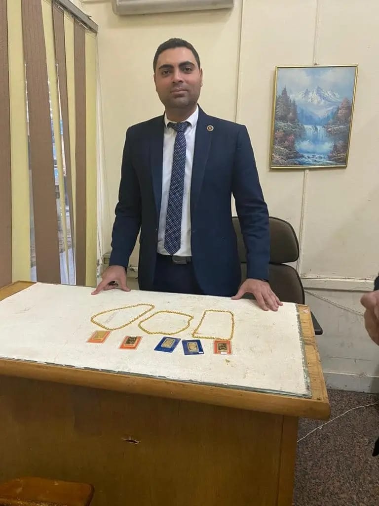 وقام ريمون غطاس مدير الحركة المشرف على صالة الوصول بتشكيل لجنة مكونة من محمود صابر ووليد أحمد عبد الستار مأموري الجمرك لتفتيش أمتعة الراكب وتفتيشه ذاتيا فتبين وجود ٥ سبائك ذهبية وعدد من السلاسل الذهبية بوزن ٧٧٠ جرام تقريبا بالتفتيش الذاتى للراكب.
