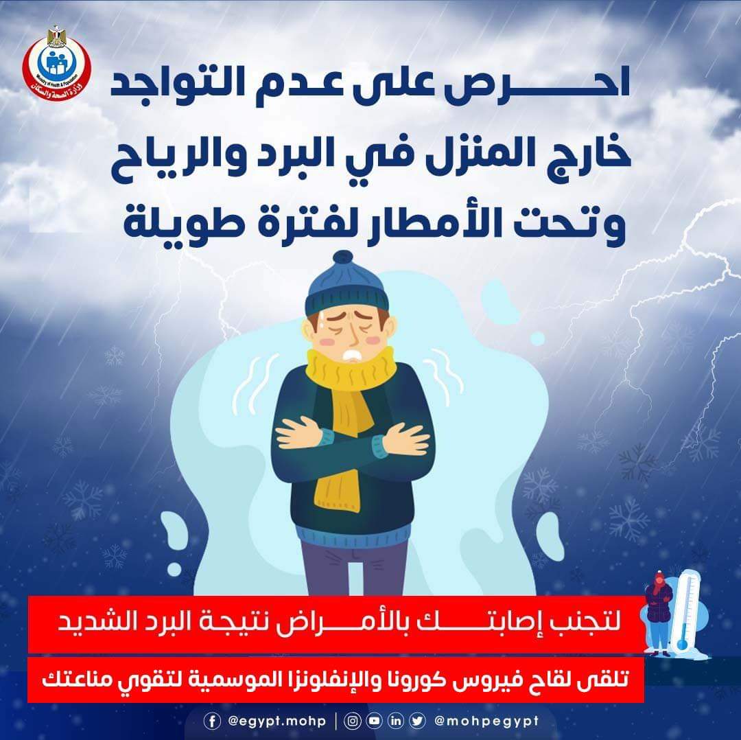 نشرت وزارة الصحة والسكان تنبيها للمواطنين، بعدم التواجد خارج المنزل في فترات البرد الشديد والرياح والأمطار لفترات طويلة لتجنب الإصابة بنزلات البرد الشديدة.