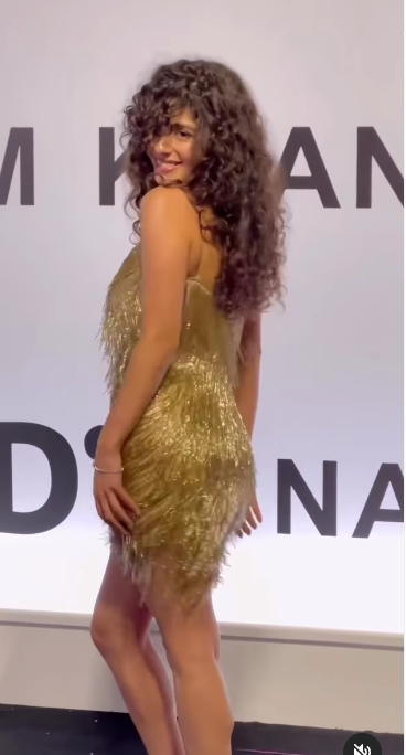 وظهرت مايان بإطلالة جذابة مرتدية فستانا قصير فوق الركبة ومكشوف الاكتاف و الصدر باللون الذهبى.