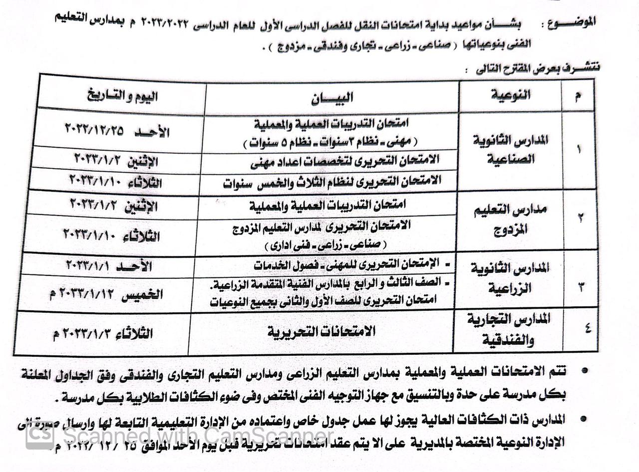 وامتحانات الإعدادية العامة والرياضية والصم والمكفوفين من الاربعاء ١٨ يناير حتى الاربعاء ٢٥ يناير ، والإعدادية المهنية من الاربعاء ١٨ يناير حتى الاربعاء ٢٥ يناير وامتحانات النقل للتعليم الفني من الإثنين ٩ يناير حتى الاربعاء ٢٥ يناير .