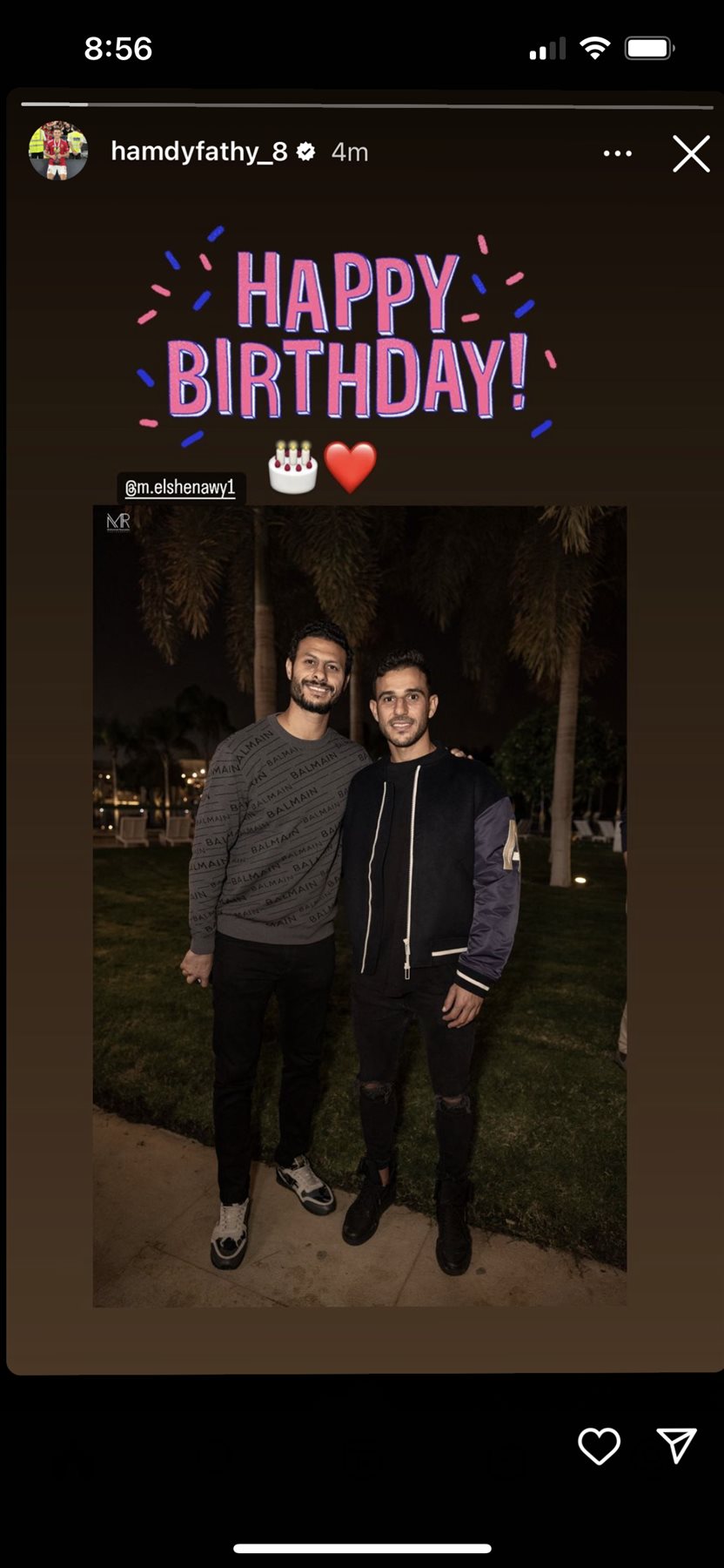 هنأ لاعب النادي الأهلي، حمدي فتحي، زميله بالفريق الحارس محمد الشناوي، بمناسبة عيد ميلاده عبر حسابه الشخصي على موقع التواصل الاجتماعي انستجرام.