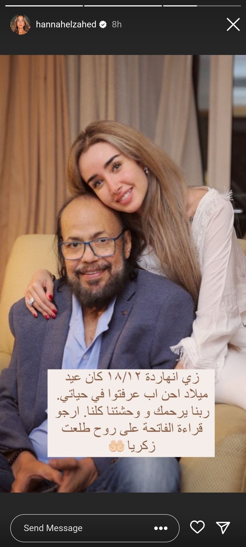 وقالت هنا الزاهد: " زى النهارده 18 /12 كان عيد ميلاد أحن أب عرفته في حياتي.. ربنا يرحمك ووحشتنا كلنا.. أرجو قراءة الفاتحة على روح طلعت زكريا".