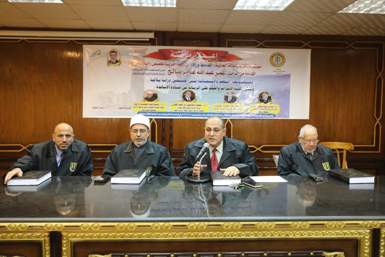 وفي ختام المناقشة قررت اللجنة منح الباحث عمر عبد الله عامر صالح المدرس المساعد بقسم البلاغة والنقد بكلية الدراسات الإسلامية والعربية للبنين جامعة الأزهر بالزقازيق درجة العالمية (الدكتوراه) بتقدير مرتبة الشرف الأولى، وأشادت اللجنة بموضوع البحث الذي يعد إضافة حقيقية للمكتبة العلمية.