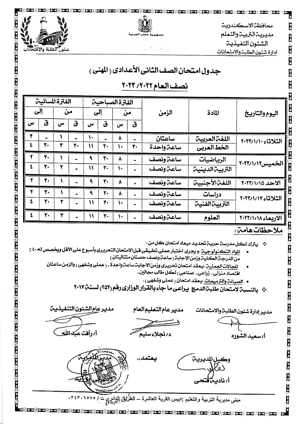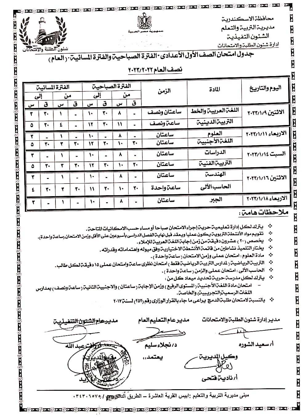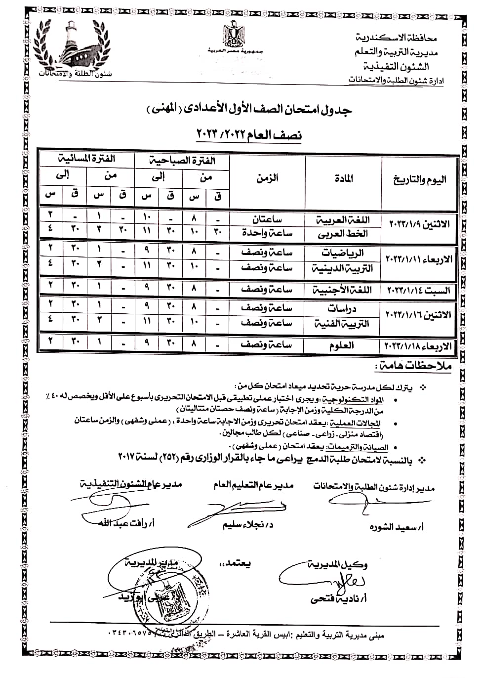 اعتمد اللواء محمد الشريف محافظ الإسكندرية، اليوم، مواعيد امتحانات الفصل الدراسي الأول للعام الدراسي 2022/ 2023 لجميع سنوات النقل بالتعليم العام والتعليم الفني والشهادة الإعدادية، على أن تبدأ الامتحانات في 9 يناير وتنتهي في 25 يناير 2023 وذلك وفق الخريطة الزمنية التي وافق عليها المجلس الأعلى للتعليم قبل الجامعي لهذا العام الدراسي.