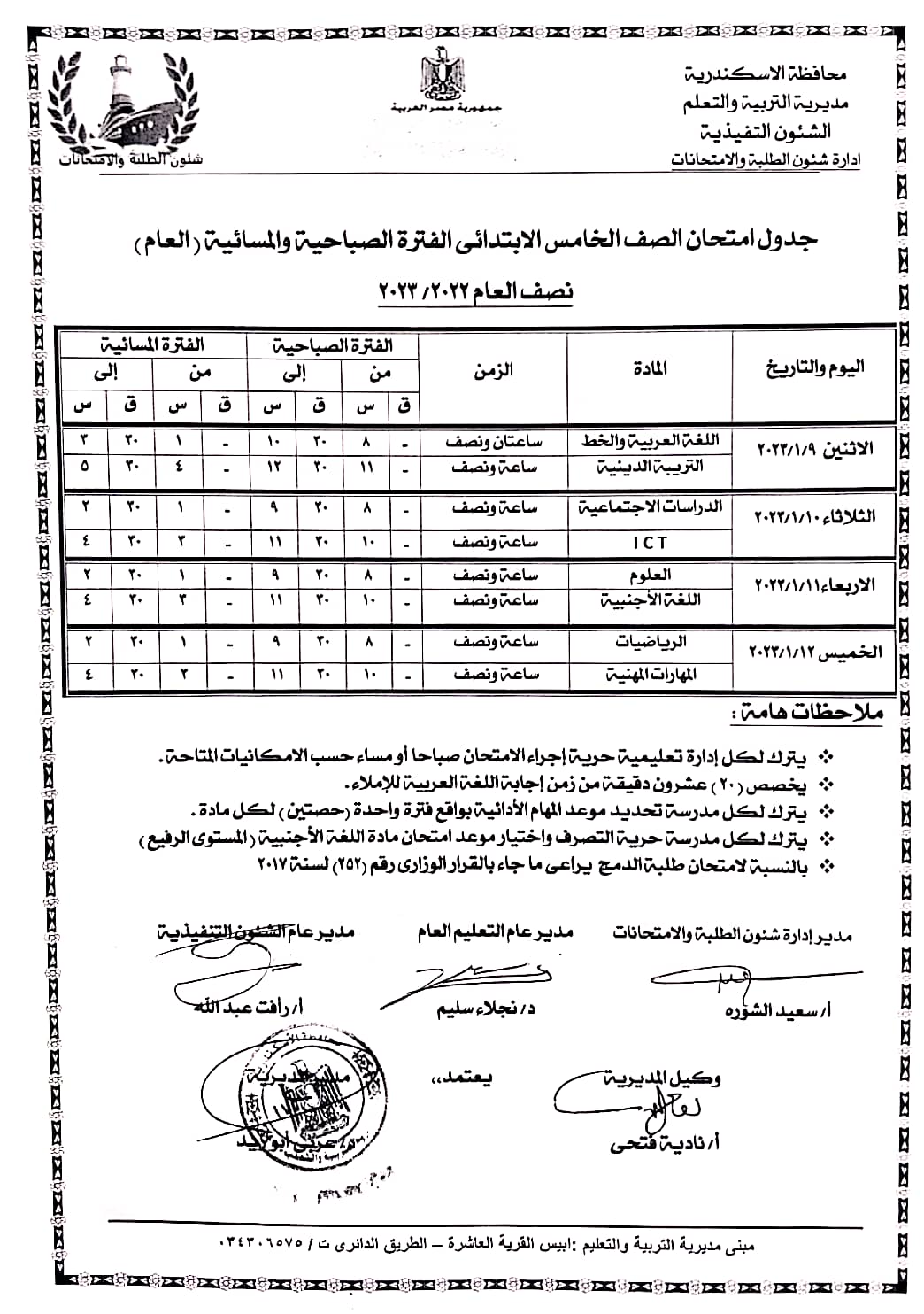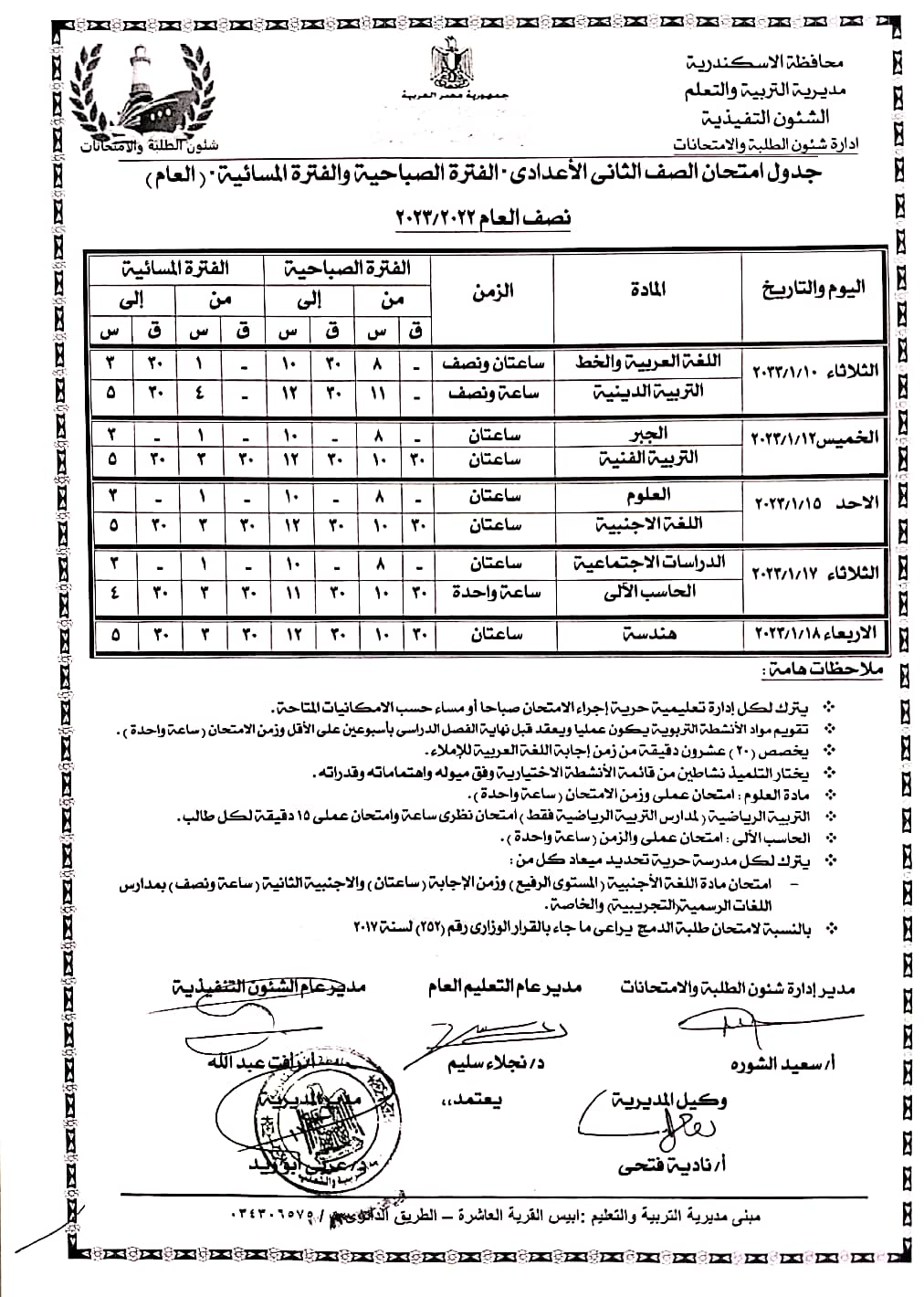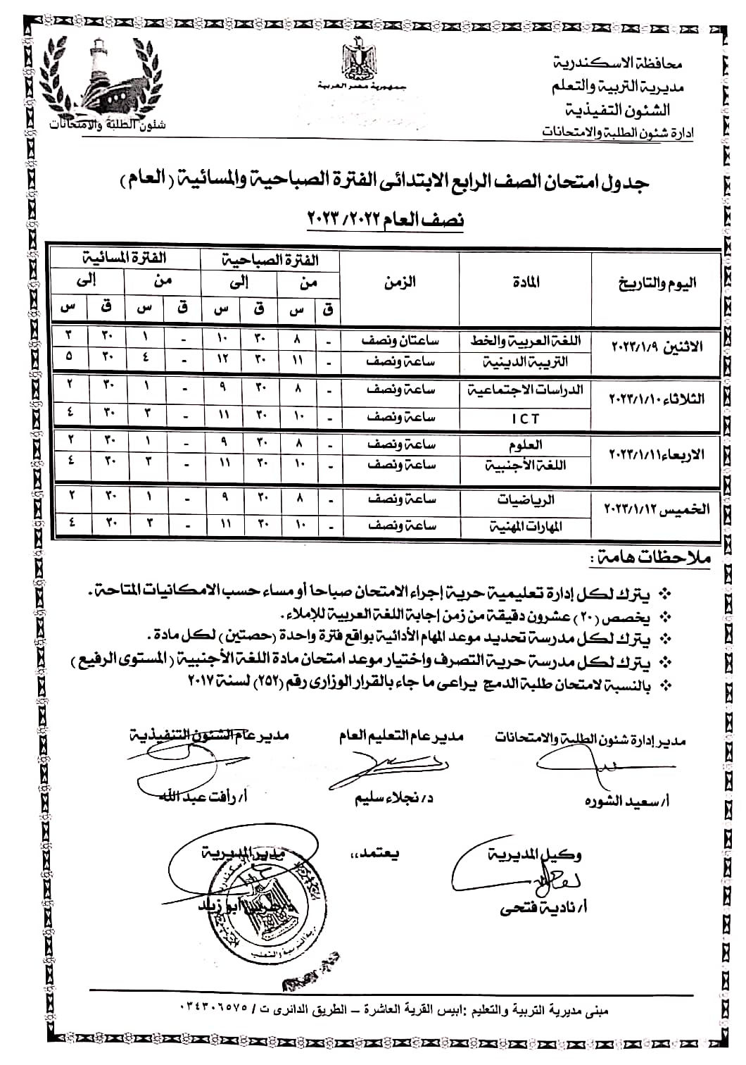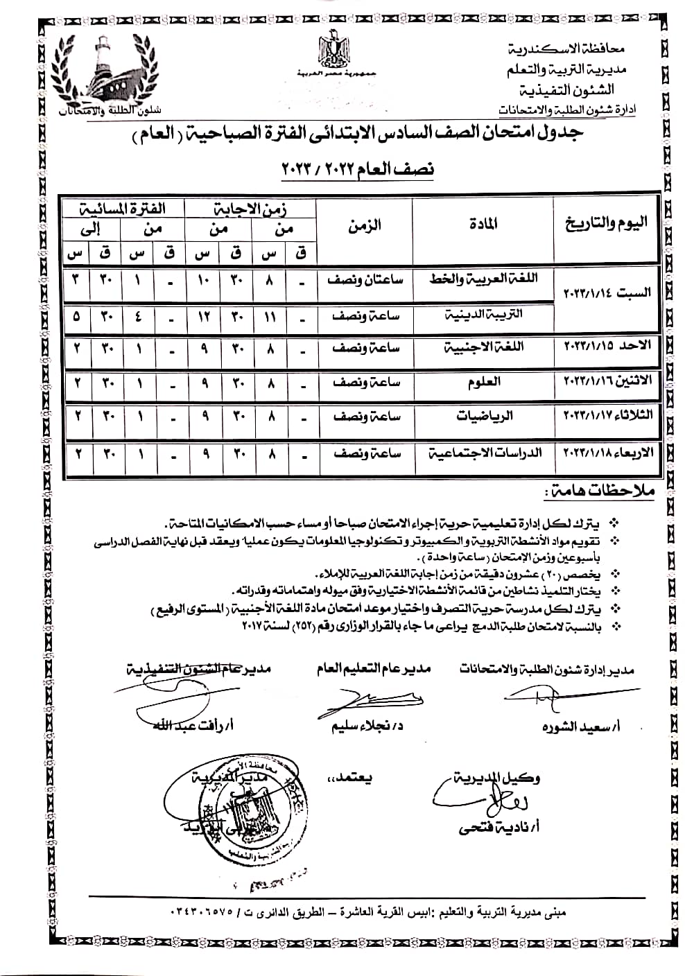 اعتمد اللواء محمد الشريف محافظ الإسكندرية، اليوم، مواعيد امتحانات الفصل الدراسي الأول للعام الدراسي 2022/ 2023 لجميع سنوات النقل بالتعليم العام والتعليم الفني والشهادة الإعدادية، على أن تبدأ الامتحانات في 9 يناير وتنتهي في 25 يناير 2023 وذلك وفق الخريطة الزمنية التي وافق عليها المجلس الأعلى للتعليم قبل الجامعي لهذا العام الدراسي.