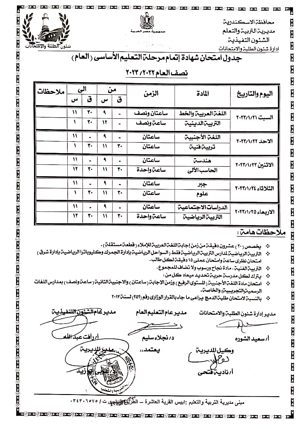 ومن جانبه؛ قال الدكتور عربي أبوزيد، أن امتحانات الفصل الدراسي الأول ستبدأ يوم الاثنين الموافق 9 يناير 2023 امتحانات المرحلة الابتدائية (عام)، والمرحلة الإعدادية (عام_ مهني_ صم_ مكفوفين)، والصف الأول والثاني الثانوي العام، والمكفوفين، والصم، والتعليم الفني.