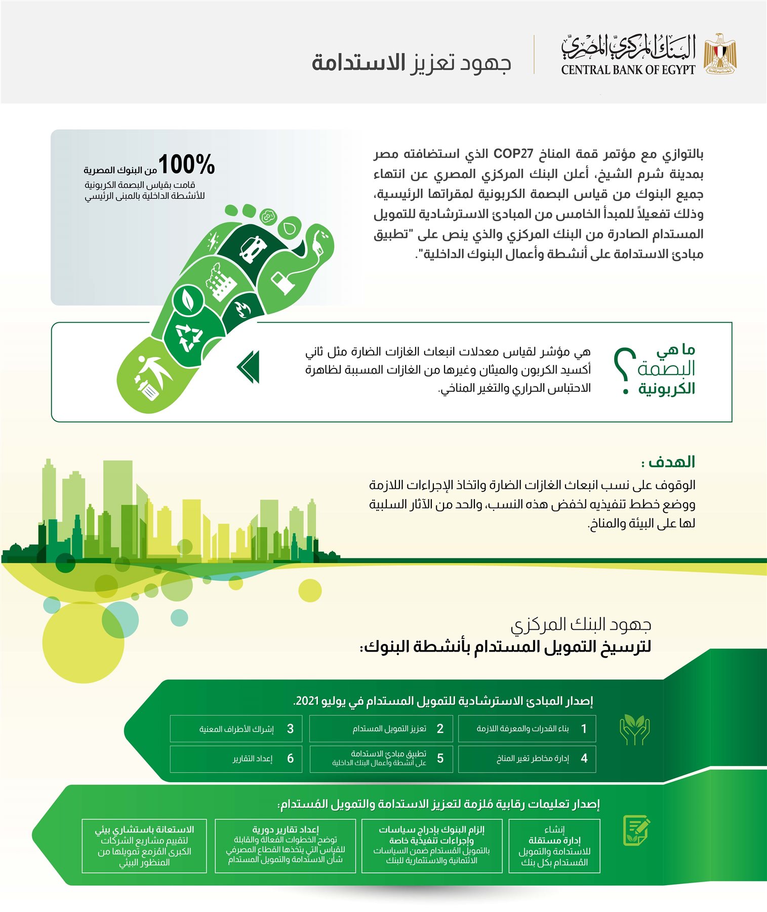 نشر البنك المركزي المصري، إنفوجراف حول جهود تعزيز الاستدامة والتي جاءت تزامنا مع انطلاق فعاليات مؤتمر قمة المناخcop 27 والذي استضافته مصر في نوفمبر الماضي بمدينة شرم الشيخ، مؤكدا أنه تم الانتهاء من قياس البصمة الكربونية لمقرات البنوك العاملة في مصر تفعيلا للمبدأ الخامس من المبادئ الاسترشادية للتمويل المستدام الصادرة ع " المركزي والتي تتضمن مبادئ الاستدامة للأنشطة وأعمال البنوك الداخلية.