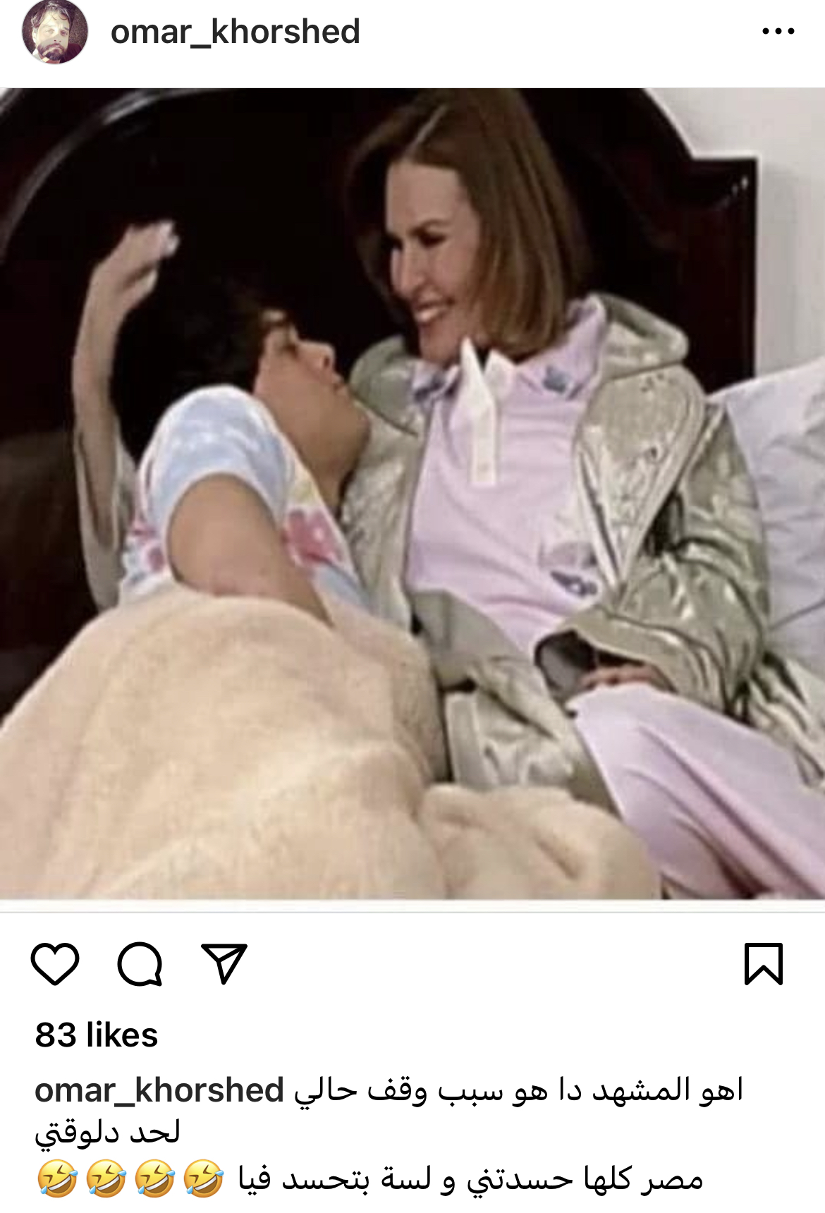 وعلق عمر خورشيد علي الصورة ممازحا :اهو المشهد دا هو سبب وقف حالي لحد دلوقتي مصر كلها حسدتني ولسة بتحسد فيا .