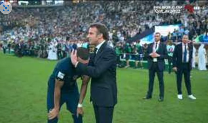 والتقطت كاميرات المصورين للمباراة مواساة الرئيس الفرنسي للاعب كيليان إمبابي، نجم المنتخب الفرنسي والذي تألق بشكل كبير، وأخذه في حضنه وجلس معه على الأرض لمواساته والتخفيف عنه بعد خسارة المنتخب الفرنسي.