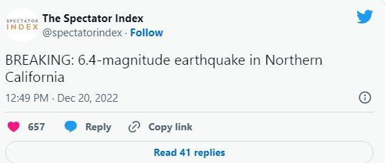 ضرب زلزال عنيف وصلت قوته إلى 6.4 درجة ولاية كاليفورنيا، اليوم الثلاثاء، وكان مركزه على بعد 130 ميلاً شمال سان فرانسيسكو، وذلك بعد ثلاثة أيام من زلزال 3.6 هز منطقة خليج سان فرانسيسكو يوم السبت.