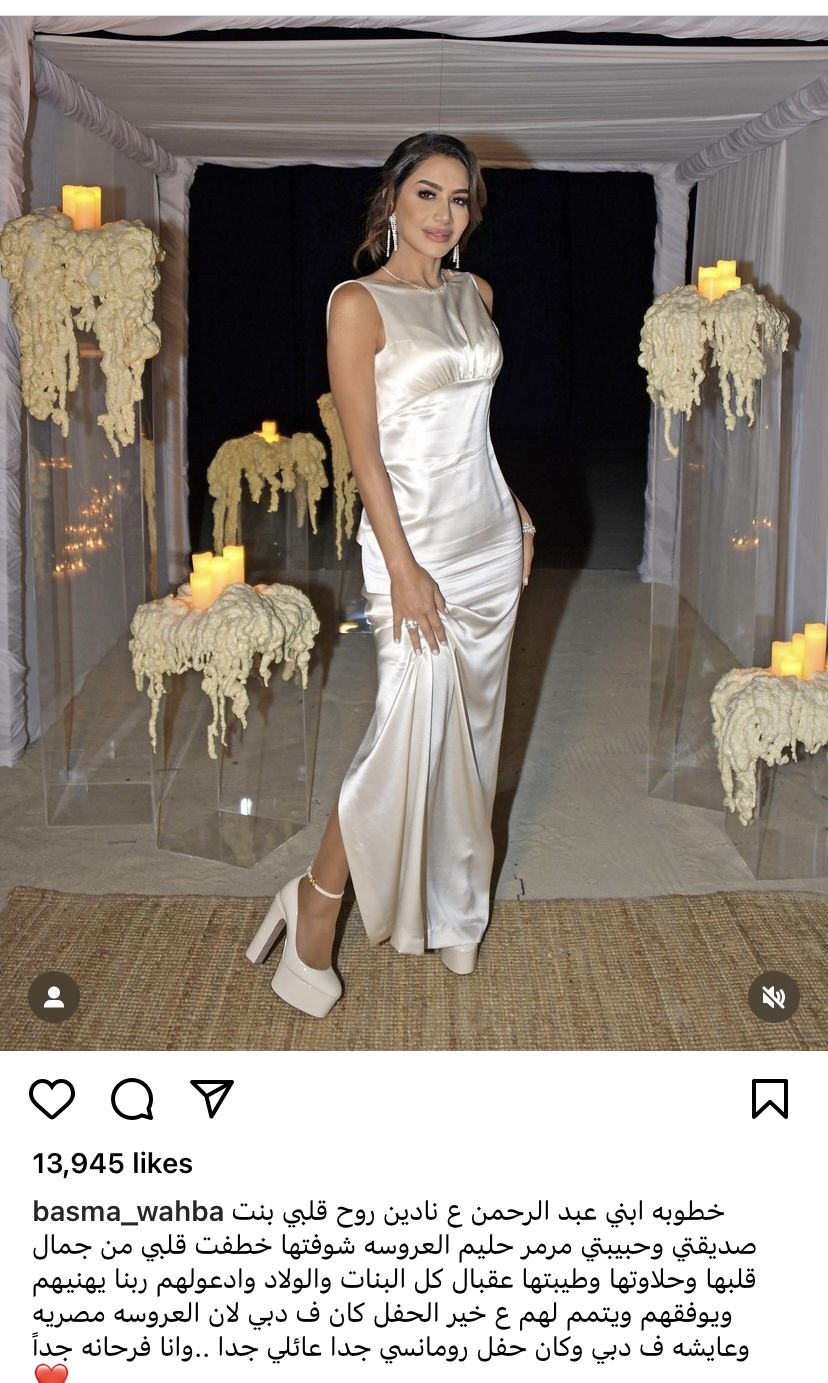 احتفلت الاعلامية بسمة وهبة بخطوبة نجلها عبد الرحمن ،ونشرت مجموعة من الصور عبر حسابها بتطبيق انستجرام وعلقت عليها :"خطوبه ابني عبد الرحمن ع نادين روح قلبي بنت صديقتي وحبيبتي مرمر حليم العروسه شوفتها خطفت قلبي من جمال قلبها وحلاوتها وطيبتها عقبال كل البنات والولاد وادعولهم ربنا يهنيهم ويوفقهم ويتمم لهم ع خير الحفل كان ف دبي لان العروسه مصريه وعايشه ف دبي وكان حفل رومانسي جدا عائلي جدا ..وانا فرحانه جداً".