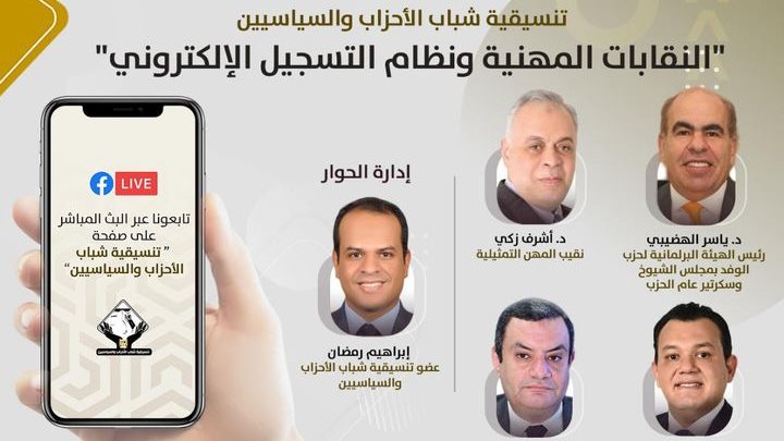 تنظم تنسيقية شباب الأحزاب والسياسيين، صالونًا سياسياً غدا بعنوان "النقابات المهنية ونظام التسجيل الإلكتروني، وذلك في إطار الفعاليات التي تنظمها التنسيقية، ضمن استعداداتها للحوار الوطني.