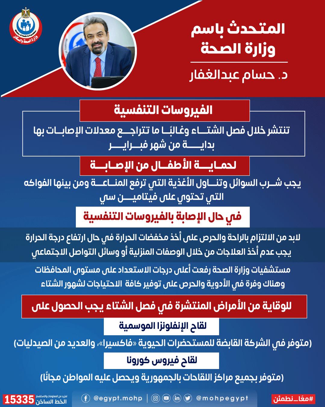 قال الدكتور حسام عبدالغفار المتحدث باسم وزارة الصحة والسكان ، إن الفيروسات التنفسية