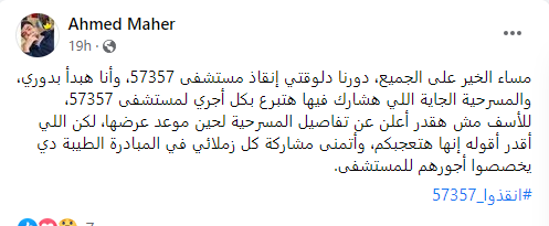 "مساء الخير على الجميع، دورنا دلوقتي إنقاذ مستشفى 57357، وأنا هبدأ بدوري، والمسرحية الجاية اللي هشارك فيها هتبرع بكل أجري لمستشفى 57357".